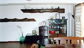 友達がたくさん集まってゆっくりとすごせるように、リビングとダイニングを1つにして広い空間にしました。モダンな家具を生かすために、壁は白く塗り壁風にして、棚板も自然木彫で仕上げました。