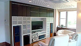 スピーカーの収納家具は三重にし、不快な音の発生を抑えました。直接照明は一切使わず、間接・半間接照明だけでしっとりと落ち着いた雰囲気を演出しました。