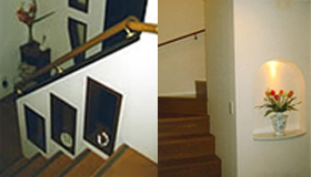 廊下が昼間でも暗いため、明るくリフォームしました。洗面所壁に筋交を避けて変形で上下対称の明かり窓を2箇所作り、アクセントとして玄関ホールにはニッチ、階段には飾り窓を設けました。ニッチには高級感を出すため、大理石カウンター・ダウンライトを付けました。