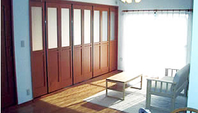 日当たりの良さを活かした床・壁・ドアのコーディネートすることで居心地のいい光の演出を行いました。日が差し込むたびに温もりを感じることのできるリビングルームに仕上げています。壁を取り去り、間仕切り建具を入れました。